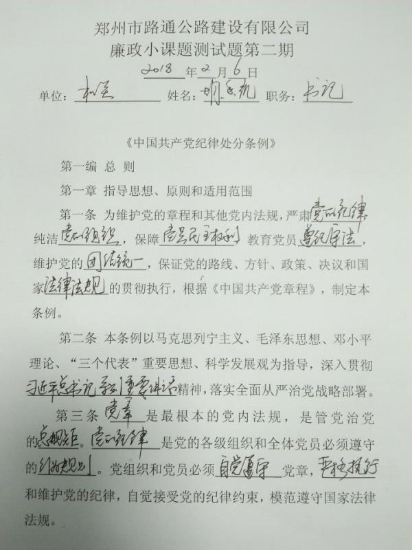 近日,鄭州市路通公司黨委在公司周例會的廉政小課堂上“正式推出”一項新舉措——廉政知識專項測試。測試內(nèi)容涉及中央八項規(guī)定精神和省市相關規(guī)定,聚焦各類黨紀政紀條例法規(guī)?荚嚥扇¢]卷的形式,對與會的公司領導、中層干部、直屬單位的領導班子進行一次嚴格的黨風廉政教育。試卷由公司紀委統(tǒng)一評分,并進行公示,成績在80分以下人員必須補考。