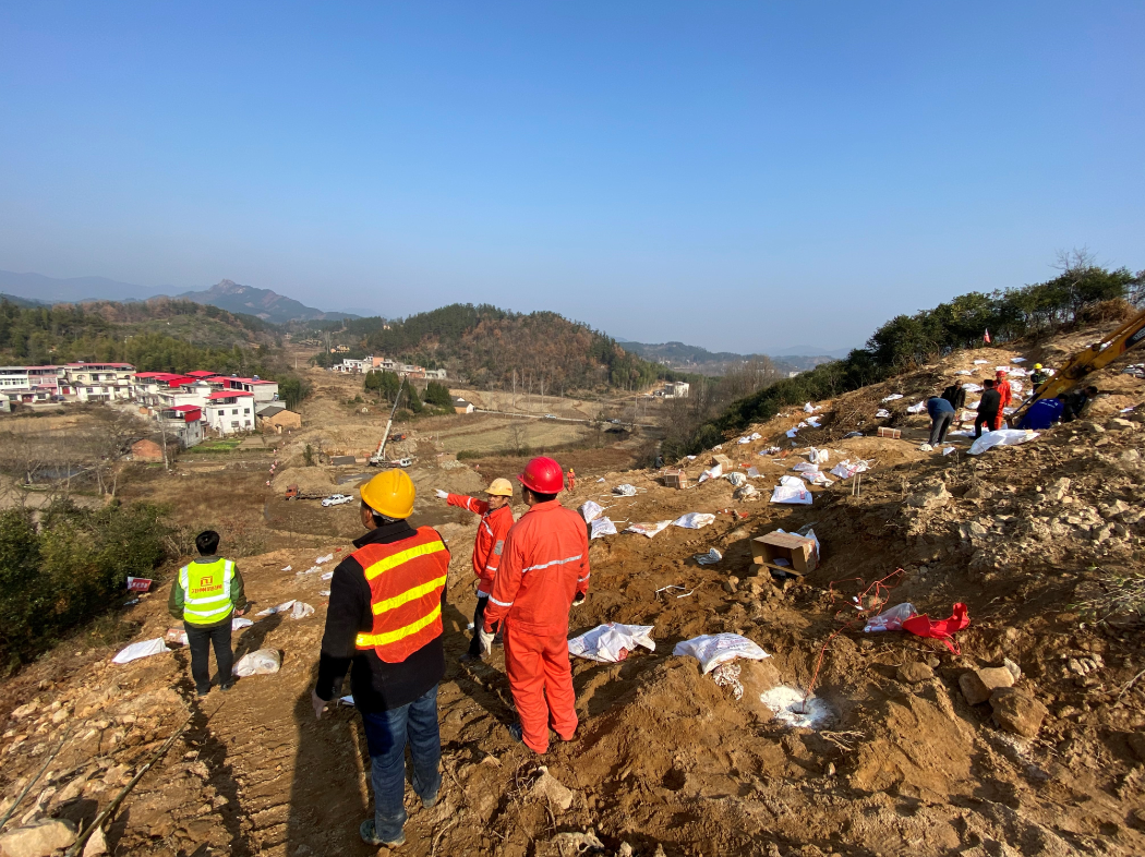 上午9點(diǎn),我部人員組織炸藥進(jìn)場(chǎng),布置于柴家沖小橋南部的山體上。本次爆破采用深孔松動(dòng)爆破方法,使用電子數(shù)碼雷管達(dá)到單孔單爆的效果,降低爆破產(chǎn)生的震動(dòng)及沖擊波。本次爆破共使用炸藥5噸,共覆蓋山體面積860㎡,炸藥埋深16-22米,爆破獲得土方、石方共13000m3。爆破過(guò)程中由項(xiàng)目部牽頭組建安全管控小隊(duì),全范圍保證安全施工,爆破過(guò)程中無(wú)任何安全事故發(fā)生。