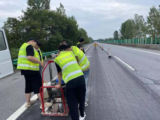 大廣高速位于我省東部,是承接河南東部南北運輸?shù)闹匾獦屑~。對于高速公路使用年限較長,重載車輛較多,路面病害顯現(xiàn)嚴重。為確保熟練掌握設備操作及技術要領,質檢中心組織經(jīng)驗豐富的試驗檢測人員進駐項目,第一時間開展檢測工作。本次取芯主要針對橫向裂縫、縱向裂縫、網(wǎng)裂、車轍擁包、塊狀修補等病害位置,為后續(xù)設計部分提供了準確的參數(shù)依據(jù)。